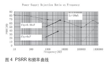 電源抑制比 (PSRR,Power supply ripple rejection ratio)是反應LDO輸出對輸入紋波抑制能力的一個交流參數,一般輸出和輸入的頻率是一樣的,PSRR的值越大說明LDO的紋波能力越強,也就是說輸入對輸出的影響很小。盡管LDO的電源抑制比很強,但都是在一定頻率內的抑制很強,一般的在50KHz到200kHz的電源抑制比還是很差的如圖4為SGM2007的PSRR和頻率曲線,而這段頻率正是大多數開關電源的工作頻率,如果LDO的負載和輸入輸出電容匹配不好,很容易引起LDO振蕩。而造成整個LDO供電系統的不穩定。