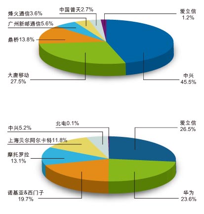 在產量方面,國內廠商正在改變全球移動設備產業的格局。2007年,華為GSM在全球銷售70多萬載頻,比2006年的35萬翻了一番。華為在GSM市場的全球市場份額因此已達21%。另一家領先的設備供應商中興,2007年在全球GSM市場出貨34萬載頻,這意味著220%的年增長率,相比2006年的10.5萬載頻增長驚人。iSuppli預測2008年中國基站總產量將為23萬臺。
