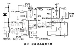 采用PIC819作為控制芯片,晶振選用20 MHz。一條指令執(zhí)行時(shí)間為0.25 μs。如圖2為斬波調(diào)壓控制電路,圖3為調(diào)頻控制電路。