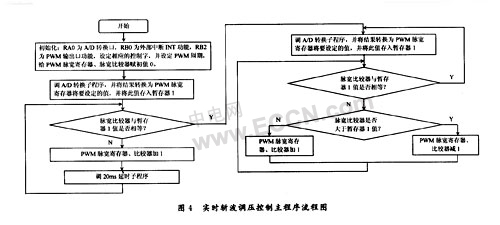 程序設(shè)計(jì)思路為:初始化,將PWM脈寬寄存器賦值為0。通過A/D轉(zhuǎn)換,將PWM的設(shè)定值采入單片機(jī),并換算為PWM脈寬寄存器將要設(shè)定的值存入暫存器。然后比較暫存器與PWM脈寬寄存器的值,逐漸增加PWM脈寬寄存器的值到等于暫存器的值。每加"1"PWM脈寬寄存器的值時(shí)調(diào)20 ms定時(shí)時(shí)間。這樣就完成緩啟動(dòng)程序。接著循環(huán)進(jìn)行A/D采樣,將換算得到的設(shè)定值存入暫存器并比較他與PWM脈寬寄存器的值,不斷調(diào)整PWM脈寬寄存器的值,使之與暫存器的值相同。這樣可以實(shí)時(shí)調(diào)節(jié)PWM的脈寬,即實(shí)時(shí)調(diào)節(jié)斬波輸出的電壓。