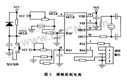 頻率的調(diào)節(jié)是通過另外一片PICl6F819芯片實(shí)現(xiàn)的,控制電路如圖3。為了使波形穩(wěn)定,程序采用非結(jié)構(gòu)化設(shè)計(jì)。