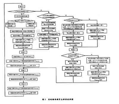 設(shè)計(jì)思想是:將兩組對(duì)管的開關(guān)控制狀態(tài)組合為4種循環(huán)狀態(tài),引腳RA2,RA4在每一個(gè)狀態(tài)中,只有惟一確定的值:01,00,10,00,循環(huán)進(jìn)行設(shè)置其狀態(tài)時(shí)間。在每一個(gè)周期內(nèi),執(zhí)行A/D采樣程序。根據(jù)采樣頻率設(shè)定值和占空比設(shè)定值來計(jì)算各狀態(tài)時(shí)間。然后將以上工作插入各狀態(tài)時(shí)間內(nèi)完成。這樣可以實(shí)時(shí)調(diào)節(jié),實(shí)時(shí)采樣,并且不會(huì)影響輸出引腳狀態(tài)發(fā)生混亂。導(dǎo)通時(shí)間ton=周期T×占空比D,關(guān)斷時(shí)間toff=周期T一導(dǎo)通時(shí)間ton程序流程如圖5所示。