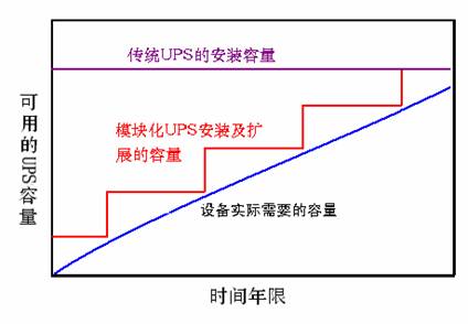 數據中心的實際需要容量跟不同UPS系統可用的安裝配置容量的關系可用下圖來表示:
