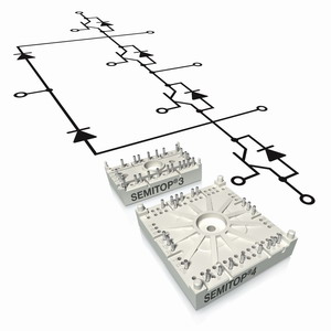 600V的IGBT反向阻斷電壓下,額定電流為20-150A。在電源應用中,模塊運行時的輸入功率在5-80kVA。用于三電平逆變器的IGBT有兩種封裝:SEMITOP® 3(55x31mm2),用于額定電流為20-50A的模塊和SEMITOP® 4(60x55mm2),用于額定電流為75-150A的模塊。