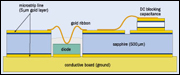圖2. 單刀雙擲(SPDT)開關通過PIN二極管傳送RF信號到地面,二極管的電阻通過正直流信號控制。該原型的制作包括:用Al/Au微帶線在500μm藍寶石電介質上形成耐高溫的微波混合集成電路(HIC),二極管上面的接觸用60μm厚的金絲連接到微波IC板上,它的背面通過熱壓輔助焊接到Ni/Au模板(接地);之后,耐高溫電介質化合物注入PIN中,以防止它在高壓下被空氣電離;SPDT開關用來保護直流電壓帶來的信號,它的電容器被設計用來將工作溫度提升到300℃以上;感應器則用單金線制成,典型的SMA連接器通過熱壓輔助焊接到微帶上。