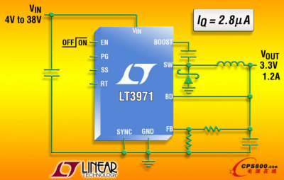 凌力爾特公司 (Linear Technology Corporation) 推出 1.2A、38V 降壓型開關穩壓器 LT3971,該器件具集成的升壓二極管。其突發模式 (Burst Mode®) 工作在無負載備用情況下保持靜態電流低于 2.8uA。LT3971 的 4.3V 至 38V 輸入電壓范圍使它非常適用于汽車和工業應用。其內部 2.4A 開關在電壓低至 1.19V 時可提供高達 1.2A 的連續輸出電流。LT3971 的突發模式工作提供超低靜態電流,使它非常適用于汽車或工業系統應用,而這些應用需要始終保持接通工作和最佳電池壽命。開關頻率從 200kHz 至 2MHz 是用戶可編程的,從而使設計師能夠優化效率,同時避開關鍵噪聲敏感頻段。其 10 引線 3mm x 3mm DFN-10 (或耐熱增強型 MSOP) 封裝加上高開關頻率,允許采用小的外部電感器和電容器,從而提供一個占板面積緊湊和高熱效率的解決方案。