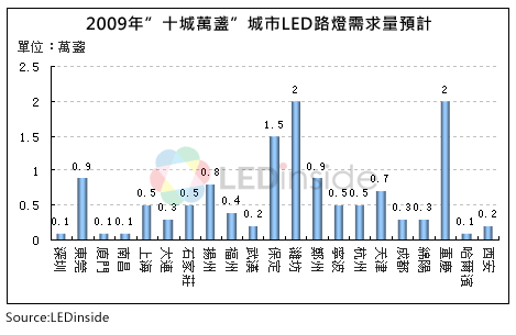 在中國政策「十城萬盞」的21個城市中,2009年只有濰坊、重慶、保定三個城市明確提出LED路燈安裝量要超過1萬盞,其他城市大都沒有明確表示LED路燈需求數量,即使有數量也在1萬盞以下,21城市中,多數城市只是建立試驗性質的示范區,總體數量較小。