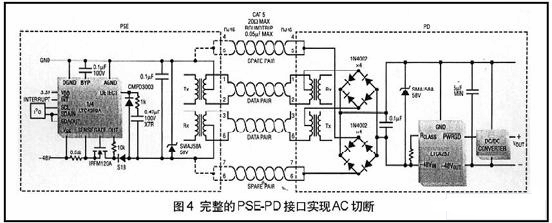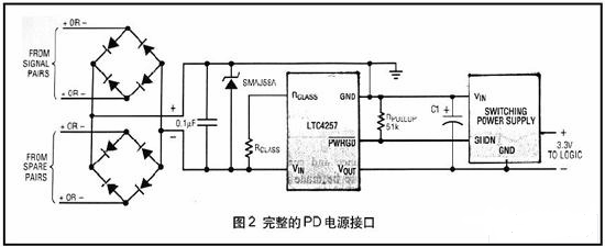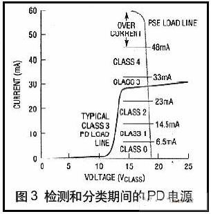所有PD(PoweredDevice用電裝置)在電壓2.7V和10.1V之間探測時,電源輸入必須呈現25KΩ左右特征阻抗。允許特征阻抗具有高達1.9V偏移串聯到所允許的二極管偏置電源調整和自動極性電路(圖2)。此特征對PSE是一種指標,表明線末端的裝置是一個有效的PD,并且48V不會損壞它。網絡接口卡和非用電插口通常呈現出150Ω左右的共模阻抗,這與有效PD阻抗相差甚運。