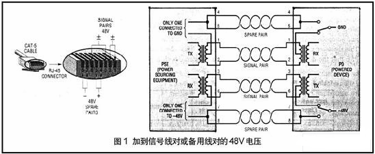 需要一個PSE(PowerSourcingEquipment 電源設備)為Ethernet的信號線對或備用線對提供額定的48V。所加電源是做為兩個供電對之間的共模電壓差,供電是借助于耦合差分信號到纜線的隔離變壓器中心抽頭,由于變壓器原因,所以,發送和接收線對之間的48V電勢差對另一端的數據收發沒有影響。