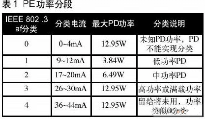 另外,在15V和20V之間探測時,會在終端呈現可變的特征阻抗。“分類”(Classification)特征表明PD從PSE汲取的最大功率,因此,PSE可以預先排定功率。分類特征表現為在輸入端被PD汲取的恒定電流。表1示出分類及其恒定電流特征。