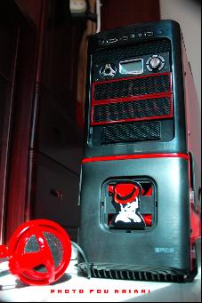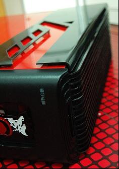 改造完成后看上去更加YY了,鋼鐵黑的面板上加入了紅色的線條,下面杰克遜的頭像近看還是相當逼真的。接口下方增加加了控制機箱內部風扇轉速的開關,中間的LED屏可以顯示CPU、 硬盤 、顯卡溫度、 定時開關機等數據,使用時對機箱內狀況一目了然。■