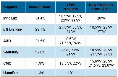 根據(jù)DisplaySearch最新一季關(guān)于LED背光源與背光模塊調(diào)查報(bào)告中指出,在2009年第三季,Innoulux是采用LED背光顯示器面板的領(lǐng)導(dǎo)廠商,出貨量市占率達(dá)34.4%(以下表一);而其它的面板廠商包含LG Display、AUO、Samsung與CMO也生產(chǎn)這類產(chǎn)品。而以品牌來看,像Samsung、Dell、LG、Acer、Lenovo、BenQ與AOC等在2009年第三季推出LED背光顯示器尺寸范圍包括了18.5”W到24”W。