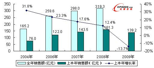 根據CSIA的初步統計,2009年上半年中國電源管理芯片銷售額為139.2億元,與2008年同期的161.3億元銷售額相比下滑13.7%,中國電源管理芯片市場首次出現大幅下滑,在經歷2008年金融危機和行業不景氣的雙重影響之后,2009年上半年中國電源管理芯片市場遭受了更為直接的下游整機產品產量大幅下滑的打擊。