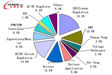 圖3 2009年上半年中國電源管理芯片市場應用結構(數據來源:CSIA)PMU市場份額有所提升,LDO市場下滑最大