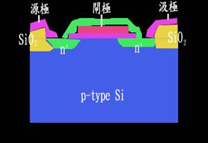 如圖所示,它是在p型的MOS兩邊形成兩個n+區,因此連同MOS的兩個端點,MOSFET總共有四個端點。氧化層上的金屬接點稱閘極(Gate),而兩個n+區分別是源極(Source)和汲極(Drain)。