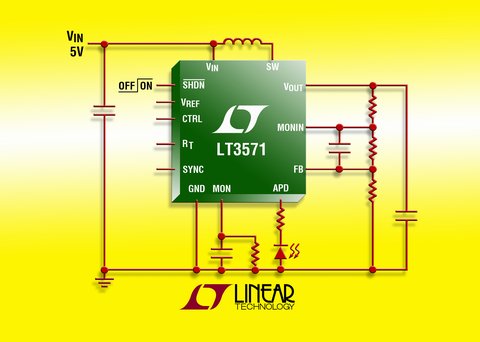 LT3571的內(nèi)部75V、350mA開關(guān)提供高達(dá)75V的輸出電壓。其開關(guān)頻率可在250kHz至2mHz之間編程,從而使設(shè)計師能夠在最大限度地減小外部組件尺寸的同時優(yōu)化效率。恒定頻率架構(gòu)用來保持輸出紋波低于500uVPK-PK,這在大多數(shù)APD應(yīng)用中都是至關(guān)重要的。為了進(jìn)一步減輕對噪聲的擔(dān)憂,LT3571是可外部同步的。LT3571兼有一個傳統(tǒng)的電壓環(huán)路和一個獨特的電流環(huán)路設(shè)計,以作為恒定電流源或恒定電壓源工作,從而提供卓越的瞬態(tài)響應(yīng)以及APD保護(hù)。該器件配備一個1.222V的內(nèi)部基準(zhǔn)和一個輔助基準(zhǔn)輸入(通過CNTRL引腳),從而在該芯片正在工作的同時實現(xiàn)輸出電壓調(diào)節(jié)而沒有任何極性反轉(zhuǎn)。其它特點包括軟啟動、內(nèi)部補償和熱停機。