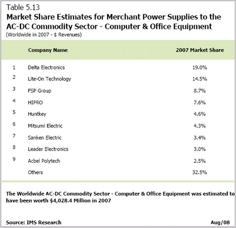 據(jù)專業(yè)調(diào)研機構(gòu)IEMS研究報告《2008世界電源市場—2008修訂版》分析顯示,航嘉2007年全球市場占有率顯著增加,電腦及辦公設(shè)備電源市場占有率躍居世界前五名。