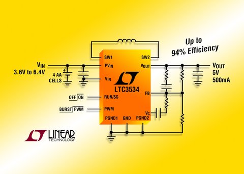 2009年2月25日-北京-凌力爾特公司(Linear Technology Corporation)推出7V同步降壓-升壓型轉換器LTC3534,該器件可利用單個電感器向一個高于、等于或低于輸入的穩定輸出提供高達500mA的輸出電流。該器件的拓撲可通過各工作模式提供連續輸送,從而使其非常適用于3或4節堿性/鎳鎘/鎳氫或單節鋰電池應用,這類應用甚至在電池電壓降至低于輸出時也必須保持恒定輸出電壓。一個典型應用是從一個具有3.6V至6.4V輸入電壓范圍的堿性電池為一個5V輸出軌供電。在大多數情況下,這個降壓-升壓型DC/DC轉換器與傳統的SEPIC解決方案相比,可以再增加25%的電池運行時間。LTC3534的1MHz恒定開關頻率在最大限度減小外部組件尺寸的同時,可確保低噪聲。纖巧的外部組件再結合3mm×5mm DFN(或SSOP-16)封裝能提供一個小占板面積的解決方案,而這一般在手持式應用中都是需要的。