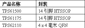 TPS61500、TPS61175與TPS62110現已開始批量生產。有關每款產品的封裝信息,敬請參見下表。