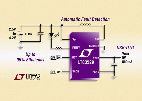 北京 近日,凌力爾特公司(Linear Technology Corporation)推出1.5MHz、電流模式同步升壓型DC/DC轉換器LTC3529,該器件具有自動過載故障檢測功能。該器件針對USB OTG(On-The-Go)的保護電路包括一個故障標記,該標記可編程為當總線過載時鎖斷或經(jīng)過一段超時時間后重新啟動。LTC3529的內(nèi)部1.5A開關可以靠單節(jié)鋰離子電池向一個固定5V輸出提供高達500mA的輸出電流。1.8V至5.25V的輸入電壓范圍使LTC3529非常適用于鋰離子/聚合物或多節(jié)堿性/鎳鎘/鎳氫金屬電池應用。同步整流實現(xiàn)高達95%的效率,從而在手持式應用中提供延長的電池運行時間。2mm×3mm DFN-8封裝結合1.5MHz的恒定開關頻率,最大限度地縮小了電感器和電容器的尺寸,從而提供一個手持式應用所需的纖巧占板面積解決方案。
