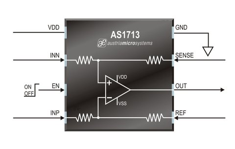 AS1713具有1倍的固定差分電壓增益,內置匹配電阻減少了外部元件數量和成本,靈活的連接方式可支持其它應用所需要的外部增益設置和調整。另外,經過調校的電阻網絡使得該器件可用作低成本通用儀表放大器。AS1713通過增加一個外部雙放大器可實現增益和阻抗變換,從而構造出經典的三放大器IA(儀表放大器)結構。