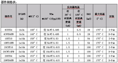 賓夕法尼亞、MALVERN—2009年2月27日,Vishay Intertechnology,Inc.(NYSE股市代號:VSH)推出四款第五代高性能45V和100V肖特基二極管---6CWT04FN、10WT10FN、20CWT10FN和20WT04FN。Vishay此次推出的器件將D-Pak的電流能力擴展至高達20A,從而確定了業界的新標準。這些器件采用次微米溝槽技術,適合用作高效率、高密度解決方案的獨立封裝,以及D2-Pak封裝的低成本小型替代品。RBSOA可實現緊湊、低成本設計。