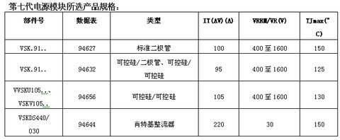 第七代模塊的二極管與可控硅組合的額定電流范圍為26A至105A,而肖特基整流器組合的額定電流范圍為110A至400A。二極管與可控硅組合的反向電壓范圍為400V至1600V,而肖特基整流器組合的反向電壓范圍為30V至150V。模塊的最大額定結(jié)溫介于125°C至175°C之間。