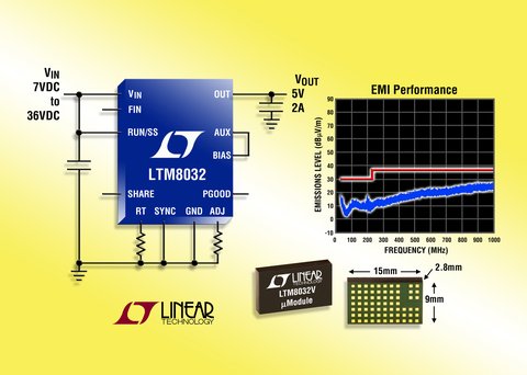 LTM8032經過一家獨立EMI測試實驗室的測試,符合EN55022 Class B輻射要求。LTM8032的開關頻率可用一個電阻調節(jié)在200kHz至2.4MHz,或者可以同步至一個外部時鐘。該器件在3.6V至36V的寬輸入電壓范圍內工作,并在電流高達2A時調節(jié)一個從0.8V至10V的輸出電壓。LTM8032的應用包括轉換和調節(jié)汽車電池電壓、分布式電源以及高壓工業(yè)和航空電子設備系統(tǒng)。
