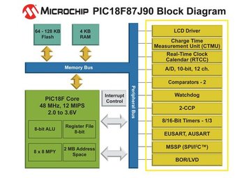 全球領先的單片機和模擬半導體供應商——Microchip Technology Inc.(美國微芯科技公司)今天宣布推出采用納瓦(nanoWatt)技術的PIC18F87J90 8位LCD直接驅動單片機(MCU)。這些64引腳和80引腳封裝的新器件,擴展了Microchip LCD MCU系列的存儲容量,并提供了更豐富的外設。新器件具備64至128KB的閃存及4KB的RAM內存,是業界首款既備有實時時鐘和日歷(RTCC),又包含容性觸摸傳感或精確時間測量所需的充電時間測量單元(CTMU)外設的8位單片機。PIC18F87J90與Microchip PIC18F85J90的引腳兼容,為Microchip全線LCD驅動單片機系列提供簡便的移植路徑,同時把應用升級化繁為簡。