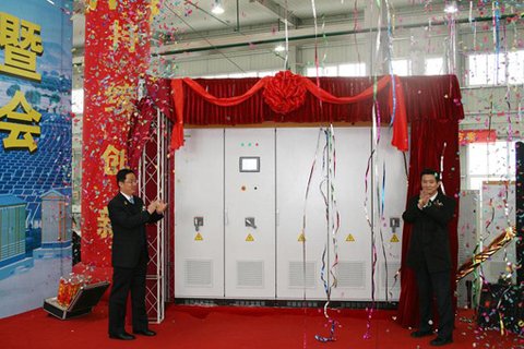 并網儀式前,徐根應廳長、楊增權副市長還共同為陽光電源最新研發成功的高壓并網光伏逆變器舉行了隆重的產品下線儀式。高壓并網光伏逆變器是陽光電源專為兆瓦級光伏電站量身定做的一體化解決方案。系統將兩臺高效逆變器、一臺中壓變壓器(定制)、交直流配電、監控通訊等設備集成于單個移動房內,從而增強了系統的安全性與可靠性,方便了系統的運輸和安裝,提高了系統的效率和發電量,是最佳的兆瓦級光伏電站解決方案。
