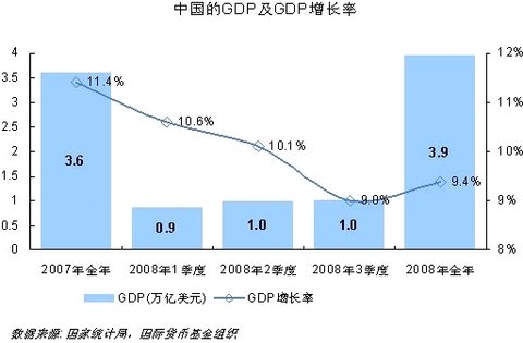 但在全球危機面前,中國經濟總體趨勢仍相對較好。根據國際貨幣基金組織十月份的預測,2008年中國GDP仍將保持9.4%的增速,GDP增速雖然有所減緩,但下降幅度不大。從國家宏觀政策層面來看,目前擴大內需的應對政策已出臺,在未來幾年內將對穩定中國經濟大局,拉動經濟發展產生積極影響。面對國際金融危機的嚴峻挑戰,中國政府果斷出手,推出當前進一步擴大內需、促進經濟增長的十大措施。初步匡算,到2010年底,約需投資4萬億元,投資領域涉及民生、“三農”、基礎設施、醫療衛生、文化教育、生態環境等社會薄弱環節,加快民生工程、基礎設施、生態環境建設和災后重建,提高城鄉居民特別是低收入群體的收入水平,促進經濟平穩較快增長。