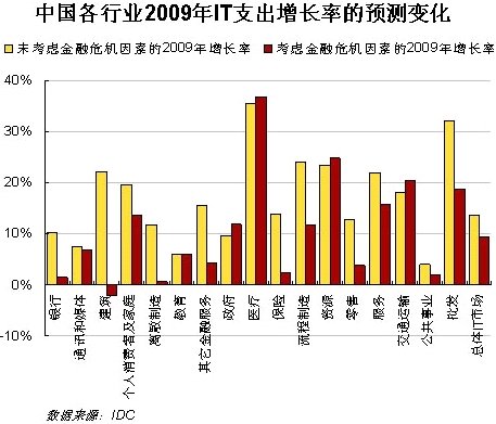 國際金融危機和中國經濟發展的減速也給中國IT產業的發展帶來了巨大的挑戰。首先,從企業IT市場來看,中國經濟發展放緩已使得市場需求開始減速。其中,首當其沖的便是IT外包市場,由于國外特別是來自美國的訂單大幅減少,IT外包市場受到了很大的沖擊;而從中國國內企業IT需求來看,受增長縮水影響最為嚴重的是中小企業市場。近年來,中小企業市場一直是各IT廠商所爭奪的藍海,很多IT企業都把這一市場作為重要的業務增長點。但由于出口量的大幅下降以及成本的上升,今年珠三角及長三角地區大量中小企業倒閉,即便是勉強維持的企業,對于IT的需求也大幅降低;再者,從國內大型企業市場來看,目前各行業受經濟危機的影響已開始逐漸顯現,一些受金融危機影響較大的行業,如金融、制造、外貿、銷售和物流行業、以及房地產,其IT需求將受到較大影響,IDC預計2009年一些受影響嚴重的行業IT需求的增長速度將明顯放緩甚至出現負增長(圖二:2009年各行業IT支出增長率的預測變化)。其次,從個人消費市場來看,中國整體經濟增速的放緩將導致消費者消費信心指數的下降,IT產品作為個人消費者的非剛性需求,也一定會受到一些影響,部分個人及家庭IT產品的需求將會有一定減弱。