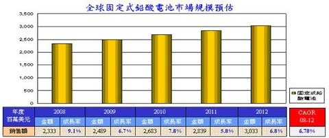(2)鉛酸電池分為啟動、動力及固定式三種,近來以固定式VRLA電池成長性佳。