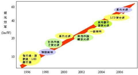 未來成長焦點-白光LED。高亮度白光LED的產品應用最為多元發展且成長性強,其需求量每年均呈現大幅度成長(如圖2),未來以手機背光源、LCD背光源、一般照明及車用光源最被看好。