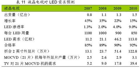 液晶電視和臺式電腦顯示器為LED 的大尺寸面板應用助力液晶電視方面,根據iSupply 在2007 年底的統計,2007 年LED 背光源液晶電視的出貨量是100 萬臺,而2007 年液晶電視的出貨量是7800萬臺,滲透率不到2%。隨著LED 技術的進步和成本的下降,預計未來滲透率會不斷提高。Displaybank 最近預測2010 年液晶電視的LED滲透率將達到6.4%,2011 年和2012 年出貨量有望達到2500 萬和5000 萬臺。我們認為Displaybank 對2010 年滲透率的估計過于保守,我們認為滲透率在9%。