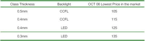 厚度方面目前LED 背光筆記本的厚度也已經取得優勢,以13.3 英寸白光LED 筆記本面板為例,厚度可以薄40%,重量可以輕20%。2、受下游筆記本廠商銷售策略影響2008 年LED 普及未達預期,LED 在各方面都優于CCFL,但其價格高于后者。RGB LED 背光比CCFL 背光筆記本面板貴50 至80 美元;白光LED 價格比CCFL高出不到25 美元,但白光LED 對CCFL 優勢會打折扣。目前市面上已經有多款LED 背光屏筆記本電腦,業內曾經預期2008 年LED 背光板會在NB 中大行其道,不過由于下游整機廠商2008 年仍然把LED 應用作為高端機型使用,其價格與普通筆記本的差額遠遠高過使用LED 背光源增加的成本。