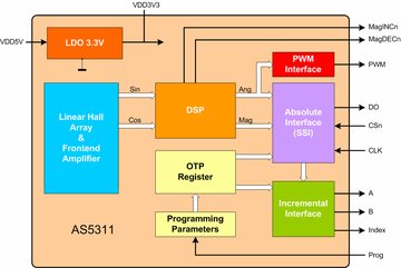 AS5311還具有擴展診斷功能,可持續(xù)監(jiān)控器件上方磁鐵的位置。這些功能可實現(xiàn)機械系統(tǒng)故障的早期檢測。此外,器件還能抵消外部干擾磁場帶來的不利影響,從而確保系統(tǒng)的安全性和可靠性。