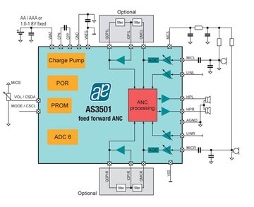 AS3501是一款針對前饋降噪的高集成、具有成本競爭力的解決方案;AS3502則是用于反饋式有源降噪的解決方案,在反饋式有源降噪系統中,麥克風內置于耳機內靠近喇叭的地方。兩款IC由1.0V 至1.8V單電源供電,結合了絕對地耳機放大器及靈活的降噪結構,與市場上大多數集成解決方案比較,一般情況下可減少60%的原器件數目。可用戶定義的內部寄存器設置能實現不同的配置,為廣泛的產品組合提供了差異性和靈活性的設計。