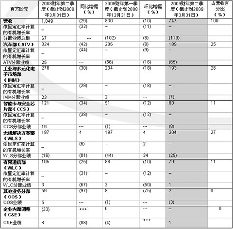 英飛凌2009財年第二季度實現營收7.47億歐元,環比下降10%,同比下降29%。英飛凌本季度的合并分部業績 為-1.10億歐元,其中計入了因應計紅利與獎金降低而產生的非經常性收益3300萬歐元。公司上個財季的合并分部業績為-1.02億歐元。