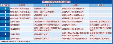 表2總結了九種不同的3D集成工藝流程,都對應從晶圓工藝一直到鍵合。