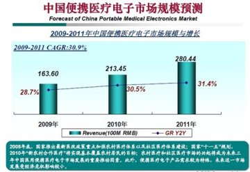 展望未來,他表示中國便攜式醫療電子市場前景非常誘人,一個方面是國家有政策支持,中國政府4萬億投資當中8500億是投到醫改當中,其中一大部分投入到農村的醫療建設當中,而在二、三級城市或者邊緣的農村地區,更適合便攜式醫療電子產品的應用。另外,他也指出隨著消費者對產品認知程度不斷升高,健康意識提升以及產業分工的不斷細化,便攜式醫療電子產品產品價格也會出現大幅度的下降,這樣更有利于市場規模擴張。他認為未來2年,中國便攜式醫療電子產品市場規模年復合增長率可以超過30%!到2011年市場規模會達到280億元!