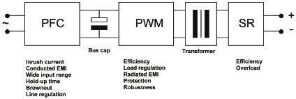 脈寬調(diào)制級(jí)(PWM)是主要的轉(zhuǎn)換器級(jí)。其中DC電壓被斬波為更高頻率的方波,因此利用更小的變壓器就可以轉(zhuǎn)換到另一個(gè)電壓級(jí)并提供隔離。并非所有的拓?fù)涠疾捎谜伎毡茸兓姆讲ǎ行┩負(fù)洳捎玫氖亲冾l,還有的則是改變兩個(gè)脈沖序列之間的相位。這一級(jí)主要確定轉(zhuǎn)換器的效率和負(fù)載調(diào)節(jié)。轉(zhuǎn)換器效率十分重要,首先它關(guān)系電源的運(yùn)行成本;其次是必須通過(guò)機(jī)箱冷卻來(lái)散除產(chǎn)生的熱量;第三是熱組件越大,就越昂貴,占用空間也越大。這三個(gè)因素與電源的使用壽命成本關(guān)系重大。