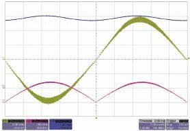 圖3中,綠色曲線的較厚區(qū)域代表電流紋波,PFC IC在峰值輸入電壓下消耗電流較多,過(guò)零時(shí)沒(méi)有電流。粉色曲線代表整流器輸入電壓,藍(lán)色曲線為輸出電壓。