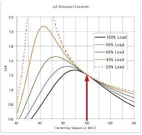 利用PFC級(jí),LLC轉(zhuǎn)換器的輸入可設(shè)置在400V左右。如果所需輸出電壓為12V、匝數(shù)比為40:1,則額定負(fù)載下需要1.2的DC增益。無(wú)論負(fù)載情況如何,頻率始終不變。