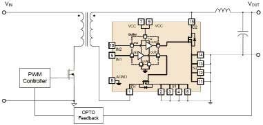 用來(lái)調(diào)整次級(jí)電壓的二極管通常由MOSFET代替,該模塊包含了柵極驅(qū)動(dòng)器和功率MOSFET,采用外引腳極寬的小型單列直插封裝,可減小寄生電感和電阻。