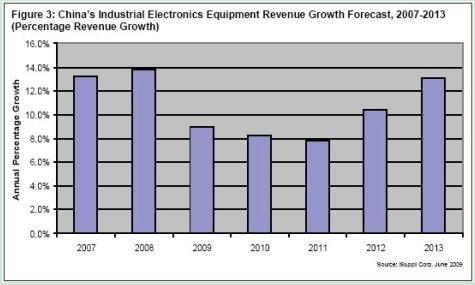 iSuppli公司預測,2009年中國的工業電子設備市場總體營業額將達到409億美元,比2008年增長8.9%。該增長率低于2008年,突顯全球經濟衰退的不利影響。