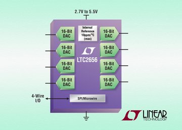 LTC2656 集成一個精確基準,實現 2ppm/ºC 的典型和 10ppm/ºC 的最大溫度系數。通過在其纖巧 20 引腳 4mm x 5mm QFN 和 TSSOP 封裝中集成基準,LTC2656 為密集排列的電路板提供進一步的空間節省。該器件靠 2.7V 至 5.5V 的單一電源工作,在基準啟動時,每個 DAC 的電源電流為很低的 375uA。該器件的 AC 性能也很卓越,因為 LTC2656 對于半標度階躍提供了 8.5us 穩定時間和 <1nV•s 的串擾,從而在 DAC 通道之間產生了極小的擾動。LTC2656 通過一個高達 50MHz 的 4 線 SPI 兼容接口通信。