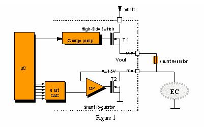 在新一代汽車外部后視鏡中,內置功能的數量大幅增加:側面回復反射器或轉向燈/閃光燈、車門外部燈、除霜器、后視鏡折疊和調節等等。除這些功能外,最近又增加了電動防眩目后視鏡控制功能:在夜里后車大燈眩光刺眼時非常需要這種防眩目的后視鏡。電動防眩目后視鏡能夠自動變暗,避免反射光照射駕駛員的雙眼。電動防眩目 (EC)鏡是一種阻容等效負載:控制EC鏡需要一個復雜的控制策略。EC鏡在透明與顏色最深之間的電壓是0V到1.2V;在顏色開始變深時,最大電流在150-250 mA之間。如果使用一個傳統的線性控制器,從12V電瓶電壓降到1.2V防眩目鏡電壓,將會損耗太多的電能(大約12-1.2V*0.15A=1.62W);考慮到電磁控制(EMC) 問題,不推薦使用開關式控制器。因此,最初嵌入在汽車電子元器件內的EC控制電路是基于一個與EC鏡并聯的并聯控制器(如圖1所示)。