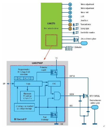 過去,在市場上有幾款車門負載執行器驅動單元。這些元器件的特點是一個可擴展的執行器驅動概念,即這些元器件的軟件和封裝相互兼容,能滿足車門電子模塊衍生設計的重復性要求。這些驅動元器件支持所有的正常的車門區負載,如車門鎖電機、后視鏡調節、折疊、加熱器(除霜器)以及從白熾燈到LED的各種照明功能。最近市場又出現了用單一元器件驅動所有車門負載的解決方案,這種元器件可產生驅動在車門上安裝的系統所需的全部主要信號,提供了一個改進的電動防眩目后視鏡控制方法。例如,意法半導體的L99DZ70XP一體化驅動芯片消除了通常在車門內部多個位置安裝分立驅動器的要求,實現了一個緊湊的一體化的車門區控制,而且提高了安裝簡易性和長期可靠性。 L99DZ70XP還為一個驅動EC元器件的小的外部MOSFET提供控制信號(如圖2所示)。這個架構可以節省空間和成本,還支持閉環電流控制,從而提高可靠性。