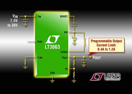 凌力爾特公司 (Linear Technology Corporation) 推出 1.2A、1.5MHz 單片電流模式降壓型開關穩壓器 LT3663,該器件具有可編程輸出電流限制。其 7.5V 至 36V 的寬輸入工作電壓范圍使 LT3663 非常適用于多種輸入電源,包括未穩壓 12V 交流適配器、24V 工業電源、Fire Wire 和汽車應用。內置輸入過壓閉鎖功能可保護器件安全承受諸如汽車應用中常見高達 60V 的輸入瞬態電壓。